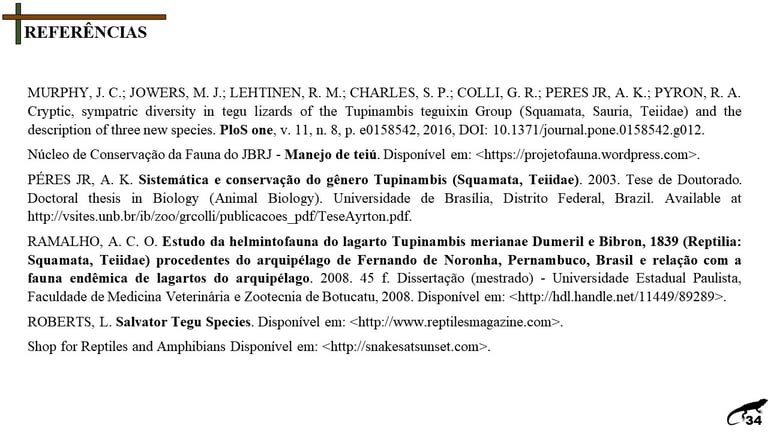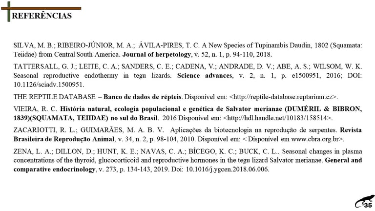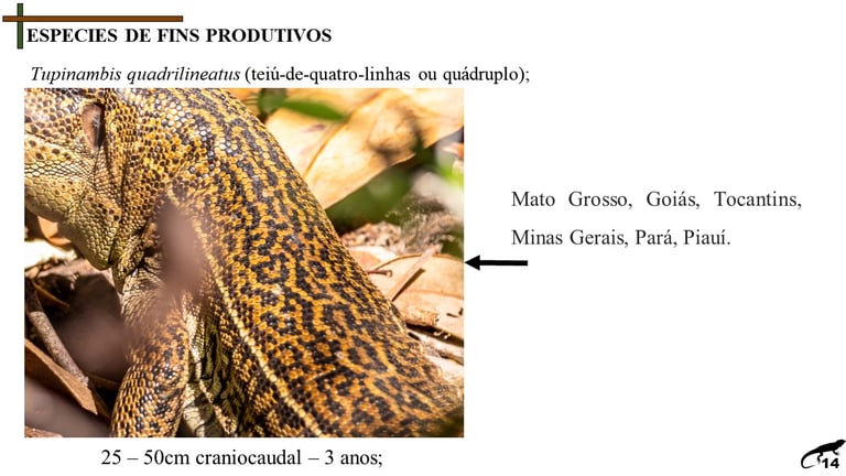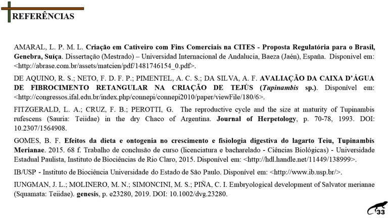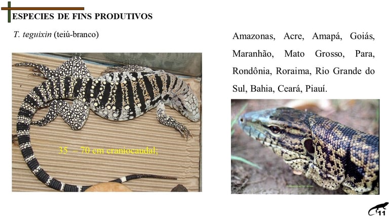 Portal AMBIENTEEMFOCO. GASPAR, R. C. & ROCHA, D. C. C. Teiús ou Lagartos, Criação e Manejo. Série: Animais Silvestres. Artigo técnico nº 2. Publicado em 2022. Disponível em https://ambienteemfoco.com/teius-ou-lagartos-criacao-e-manejo Acesso em DIA/ MÊS/ ANO